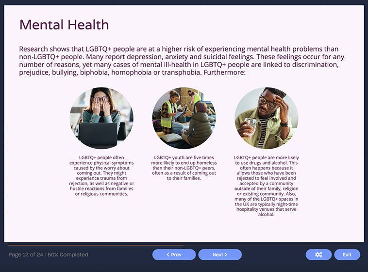 This LGBTQ+ Awareness course raises awareness of the issues faced in the workplace by lesbian, gay, bisexual, trans and queer + (LGBTQ+) people. The course helps you to recognise your responsibility for promoting equality and diversity, encouraging an inclusive environment, and reducing the likelihood of discrimination, harassment, victimisation and bullying of LGBTQ+ staff members.