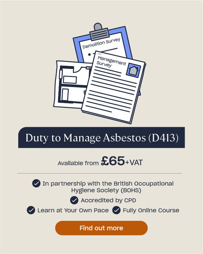 Our Duty to Manage Asbestos (D413) course is made in partnership with, and endorsed by, the British Occupational Hygiene Society (BOHS) and accredited by CPD. By taking this course, you will ensure that you have the knowledge needed to effectively manage asbestos in your premises, and that you can develop, implement and maintain the necessary systems and procedures to protect people from the risks associated with asbestos exposure.